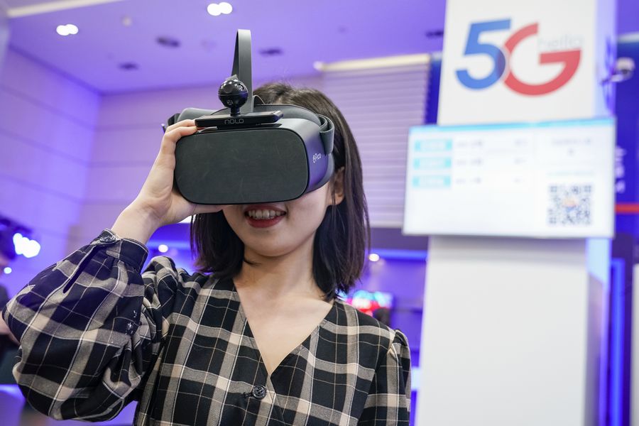 A consumer tries on a 5G cloud-based virtual reality (VR) device at a business hall of China Telecom Beijing Branch in Beijing, capital of China, Oct. 31, 2019. (Xinhua/Shen Bohan)