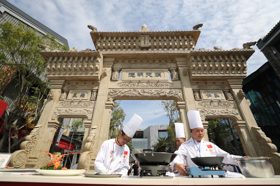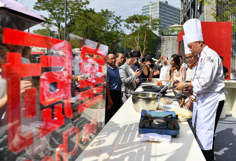 Cooks make cuisine at the food culture week in Foshan, Nov. 1, 2019. (Xinhua/Lu Ye)