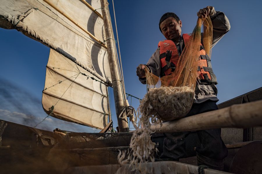 Fisherman Zhang Kaidi pours shrimps he caught into fishing boat on Dianchi Lake in Kunming, southwest China's Yunnan Province, Oct. 23, 2019. (Xinhua/Jiang Wenyao)