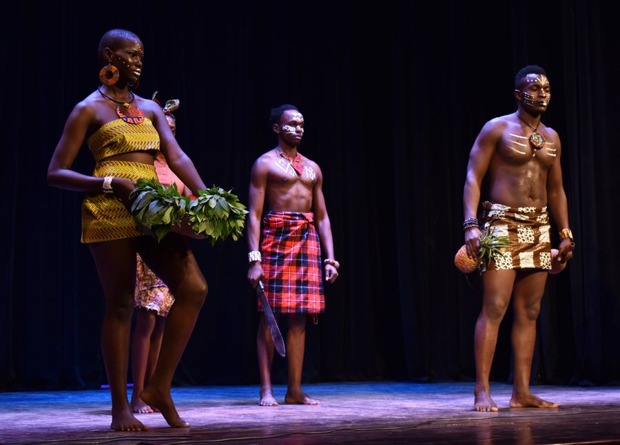 Models showcase African traditional fabric clothes during the 2019 Uganda National Cultural Centre annual art and culture festival in Kampala, capital of Uganda, Nov. 3, 2019. (Xinhua/Nicholas Kajoba)
