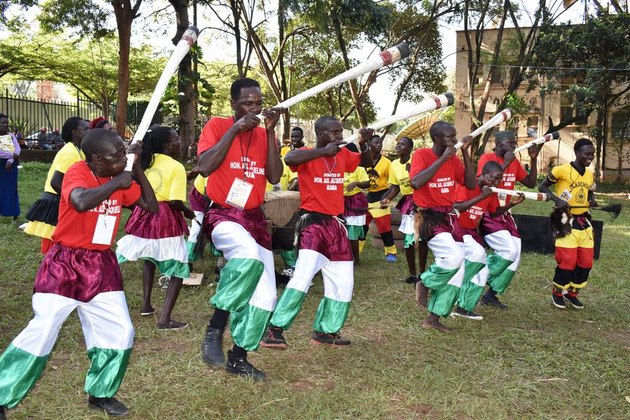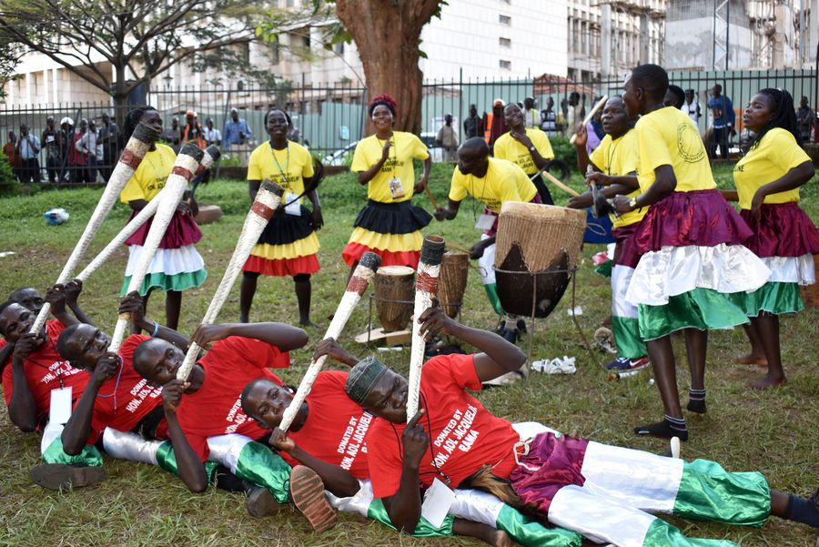 Dancers perform during the closing ceremony of the 2019 Uganda National Cultural Centre annual art and culture festival in Kampala, capital of Uganda, Nov. 3, 2019. (Xinhua/Nicholas Kajoba)