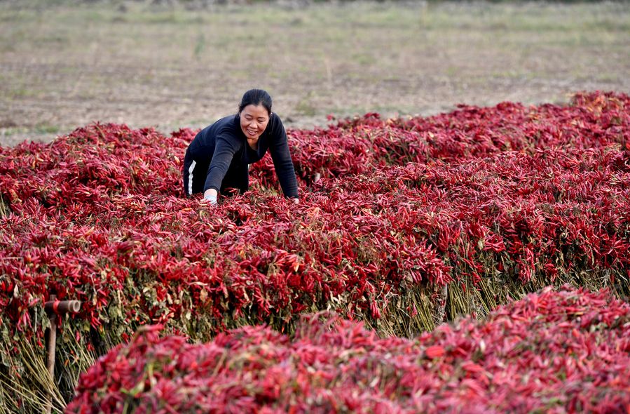 A farmer dries chili peppers in Zhouying Village, Naodian Township of Baofeng County, central China's Henan Province, on Oct. 16, 2019. (Xinhua/Li Jianan)