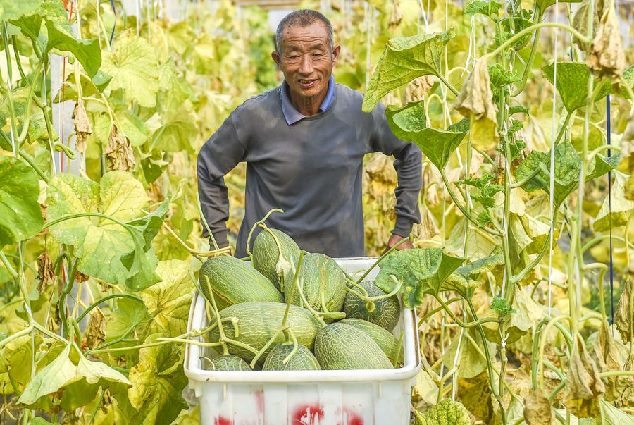 A villager delivers freshly harvested Hami melons at Guotang Village in Zaoqiang County, north China's Hebei Province, Oct. 24, 2019. (Xinhua/Li Xiaoguo)