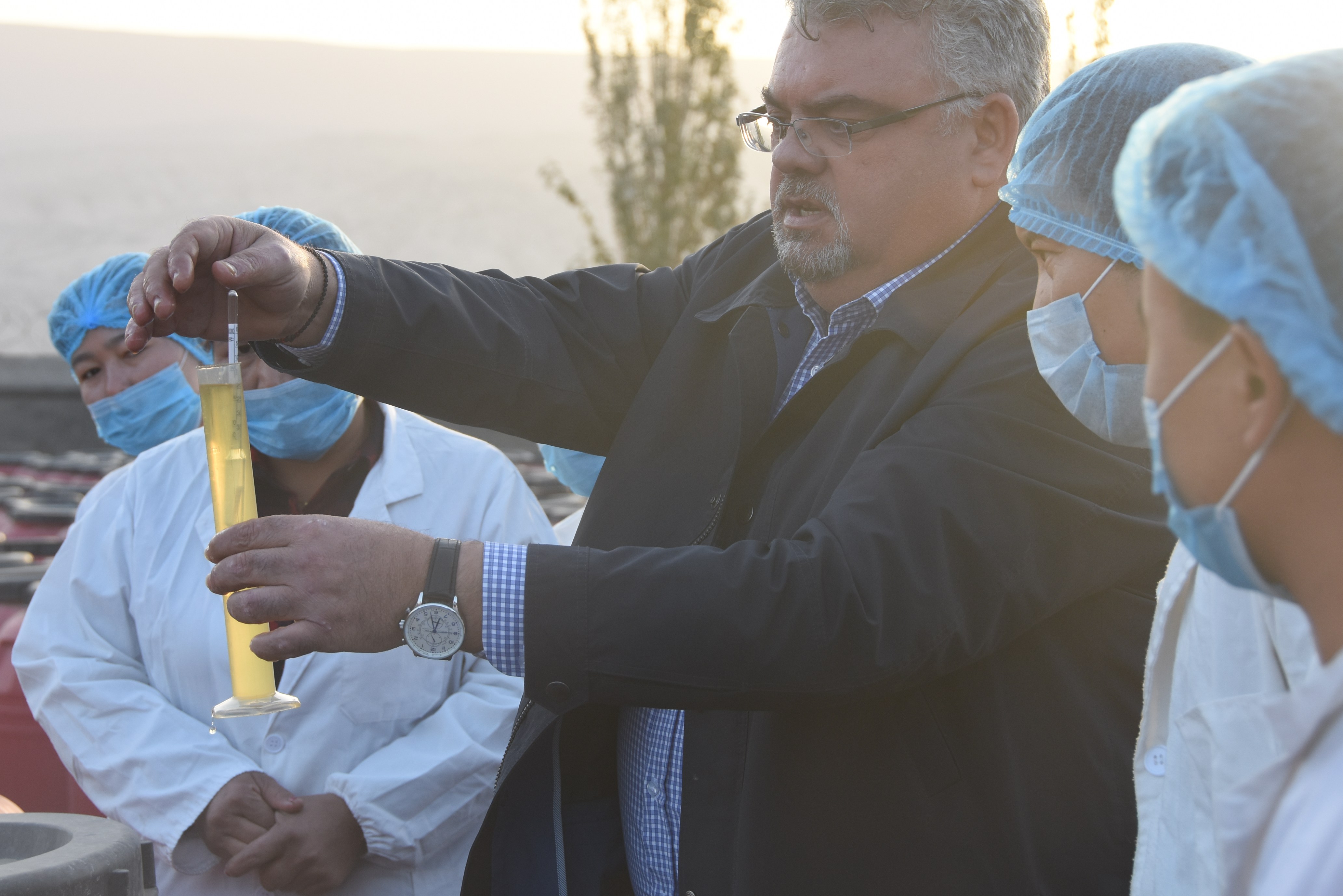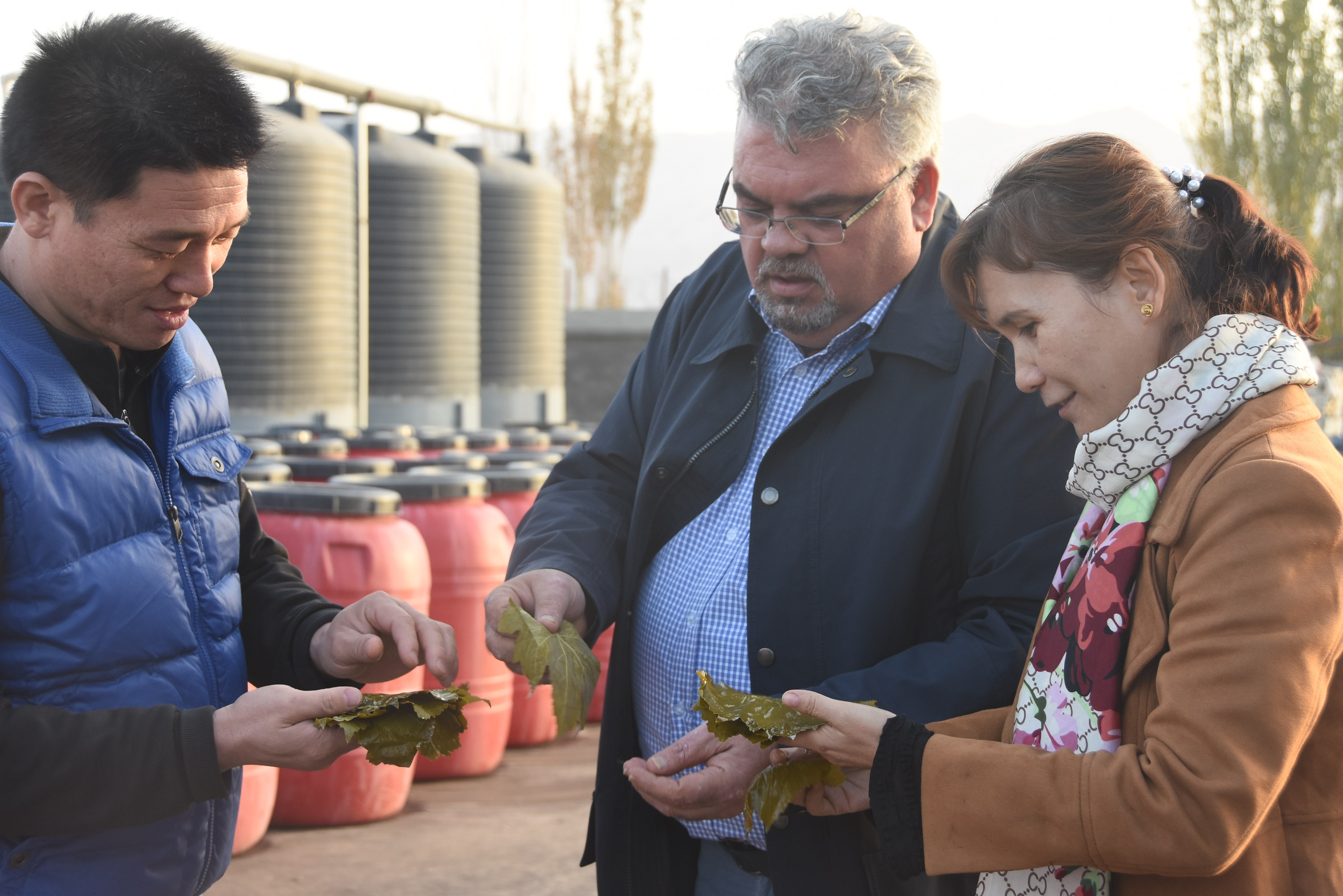 Georgios Intzes and Chinese workers examine the salt water used to preserve grape leaves on Oct. 28, 2019. (Xinhua/Zhang Xiaolong)