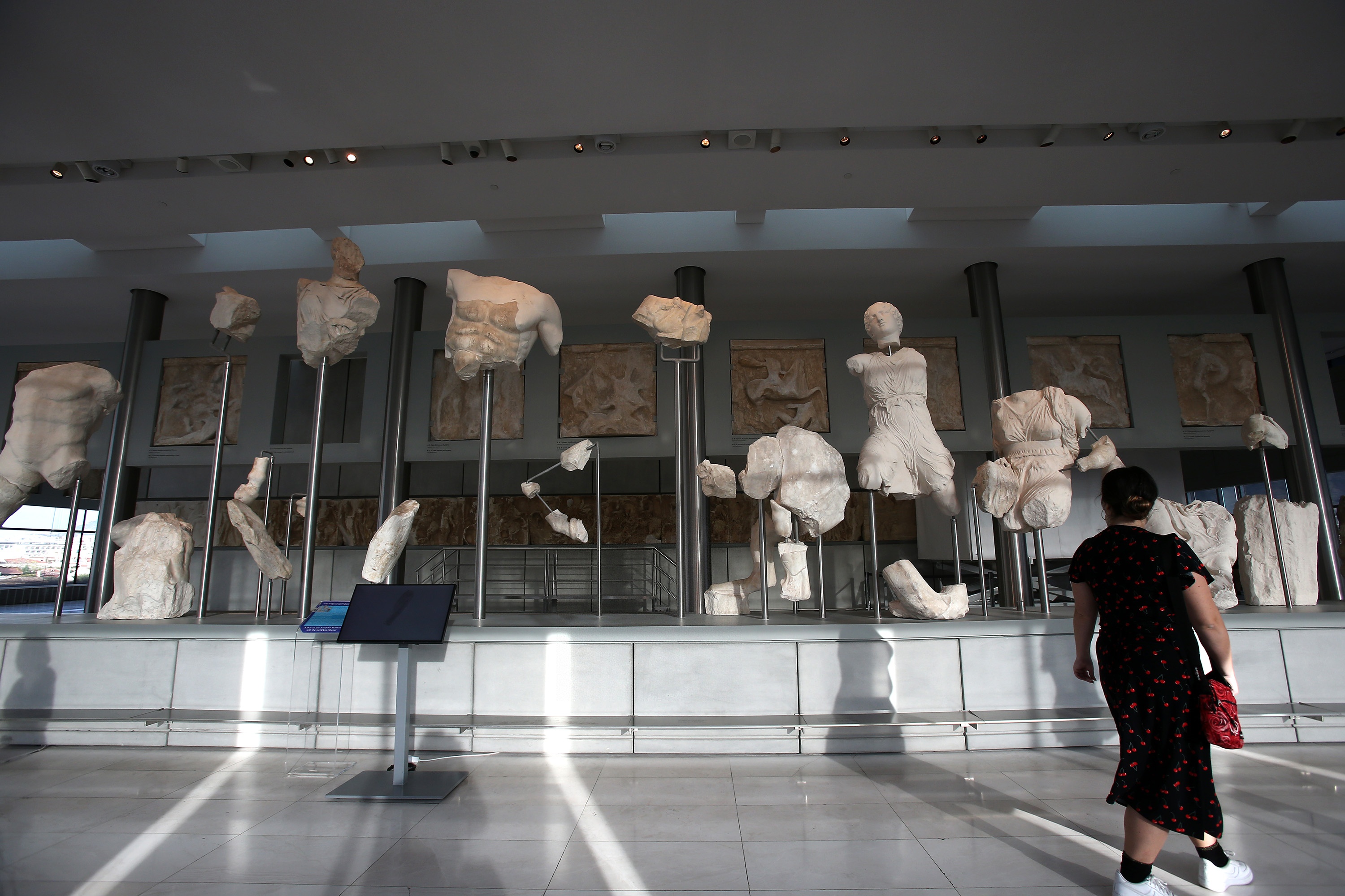 A woman visits the pediments section in the Parthenon Gallery of the Acropolis Museum in Athens, Greece, Nov. 7, 2019. (Xinhua/Marios Lolos)