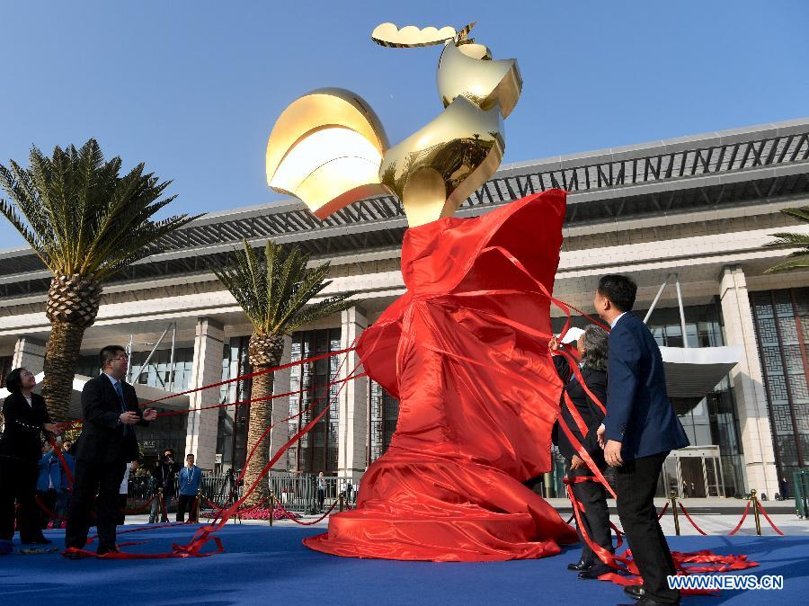 Guests unveil a symbolic golden rooster sculpture to mark the opening of the 28th China Golden Rooster and Hundred Flowers Film Festival in Xiamen, southeast China's Fujian Province, Nov. 19, 2019. A total of 28 foreign films, along with over 50 Chinese cinematic works, will be showcased during the 28th China Golden Rooster and Hundred Flowers Film Festival, which kicked off Tuesday in Xiamen. (Xinhua/Jiang Kehong)