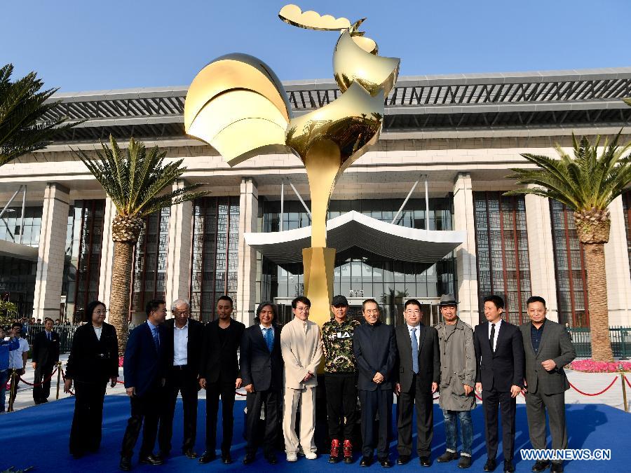 Guests pose for photos with a symbolic golden rooster sculpture for the 28th China Golden Rooster and Hundred Flowers Film Festival in Xiamen, southeast China's Fujian Province, Nov. 19, 2019. A total of 28 foreign films, along with over 50 Chinese cinematic works, will be showcased during the 28th China Golden Rooster and Hundred Flowers Film Festival, which kicked off Tuesday in Xiamen. (Xinhua/Jiang Kehong)