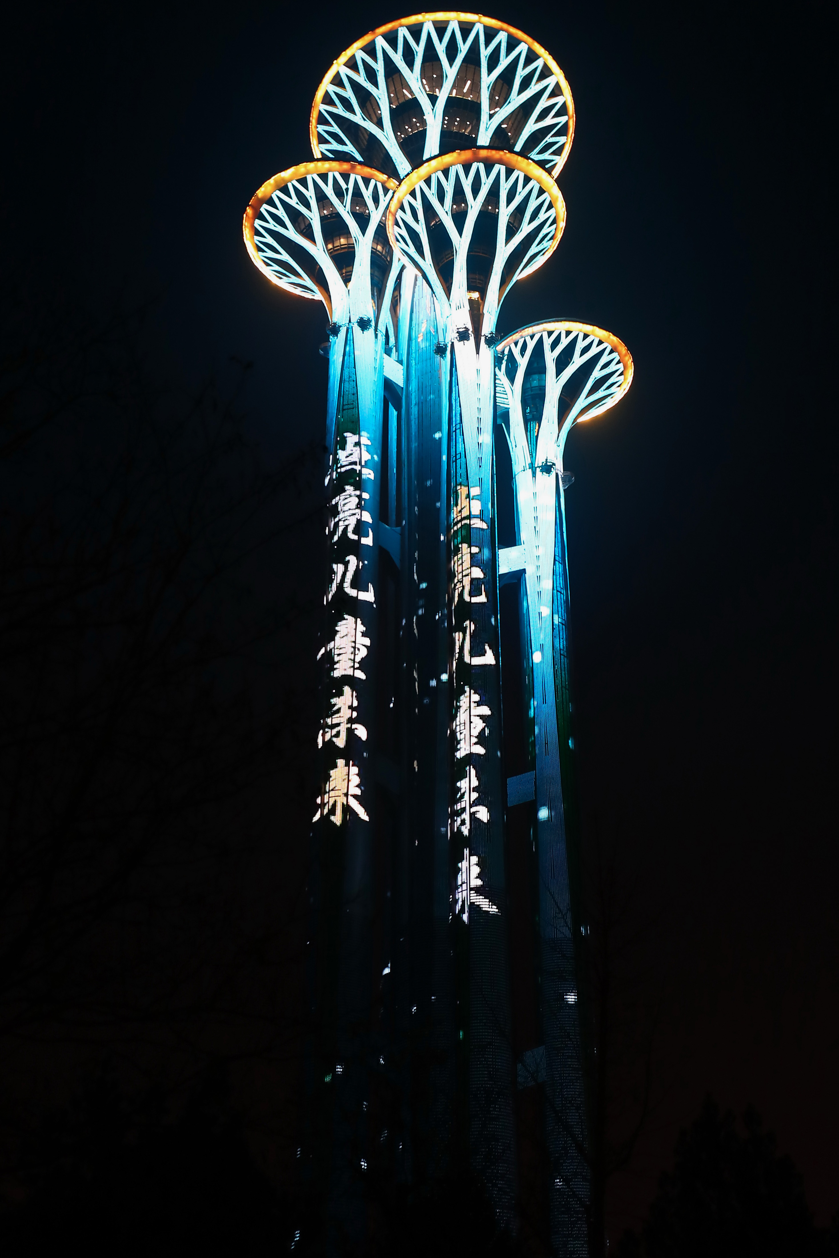 The Panda Tower exhibits blue lighting to mark World Children's Day 2019 in Chengdu, southwest China's Sichuan Province, Nov. 20, 2019. (Xinhua)