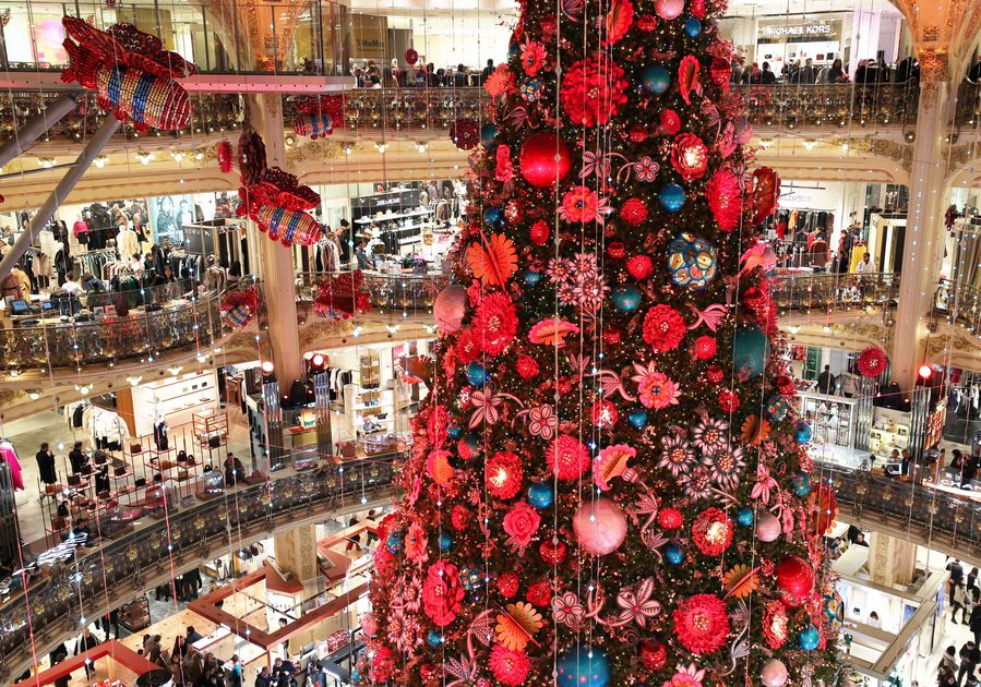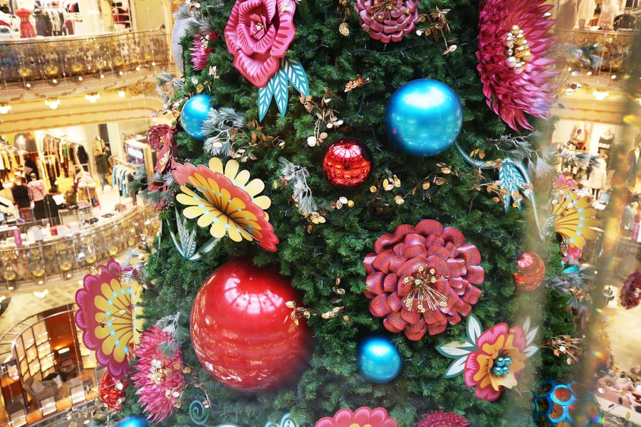 A giant Christmas tree stands at the Galeries Lafayette department store for the festive season. (Xinhua/Gao Jing)