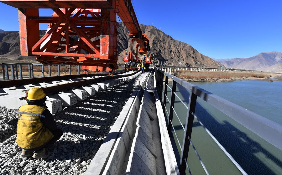 Workers of China Railway 11 Bureau Group Co., Ltd. lay steel rail for a bridge crossing the Yarlung Zangbo River of Lhasa-Nyingchi railway in Sangri County of Shannan, southwest China's Tibet Autonomous Region, Dec. 1, 2019. (Xinhua/Chogo)