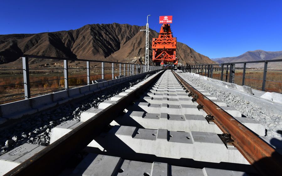 LHASA, Dec. 2, 2019 (Xinhua) -- The rail-laying work of a 4,615-meter-long bridge crossing the Yarlung Zangbo River of Lhasa-Nyingchi railway in Sangri County of southwest China's Tibet was completed on Sunday.