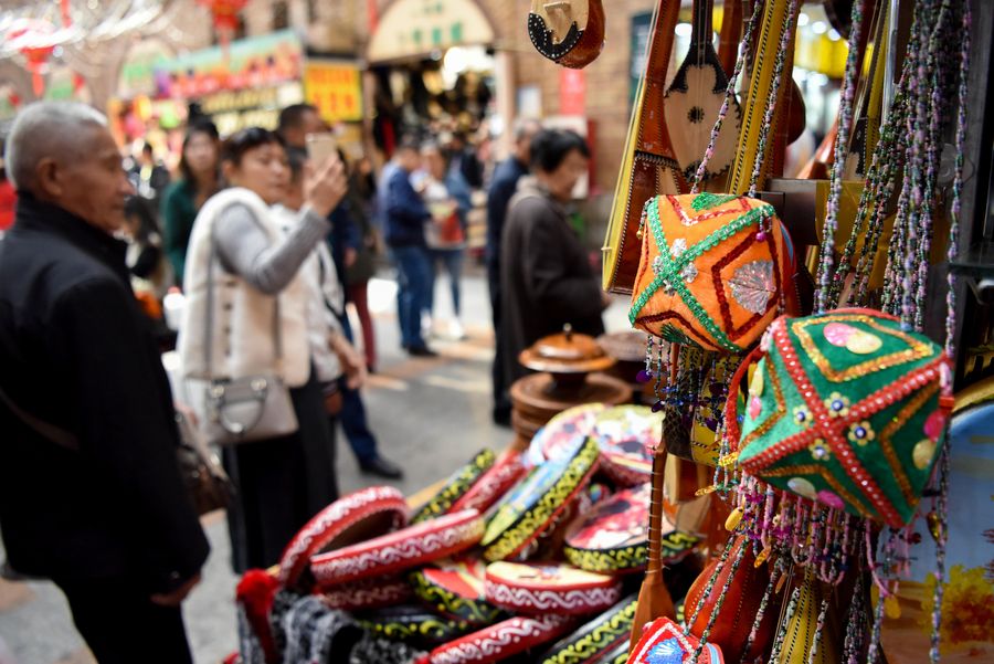 Tourists visit the Xinjiang International Grand Bazaar in Urumqi, northwest China's Xinjiang Uygur Autonomous Region, Oct. 5, 2019. (Xinhua/Ding Lei)