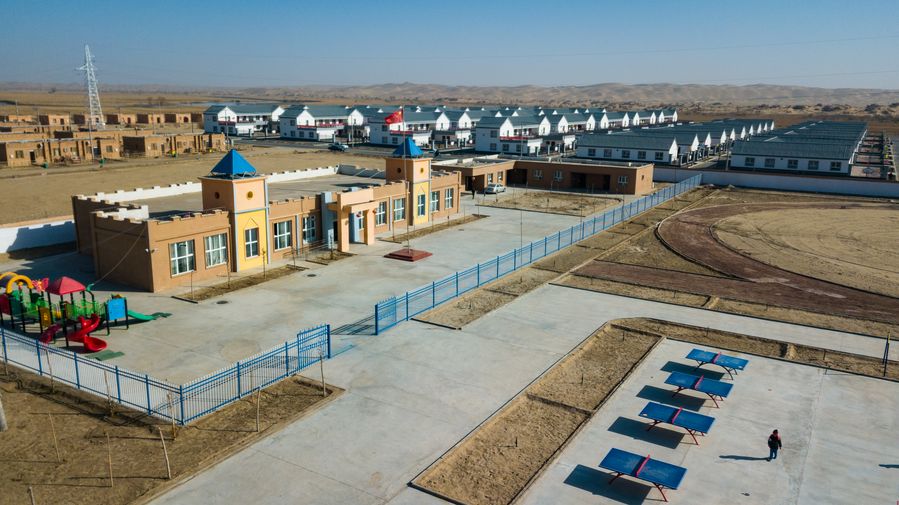 The kindergarten and school at a relocation area for Darya Boyi Town in Yutian County, northwest China's Xinjiang Uygur Autonomous Region, Nov. 19, 2019. (Xinhua/Shen Bohan)