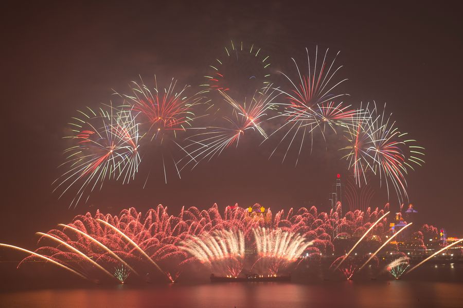 The 30-minute firework show was composed of four chapters. About 160 thousand fireworks were launched from both sides of Macao's Sai Van Bridge, bursting and lighting up the sky over the two cities.