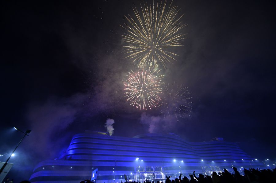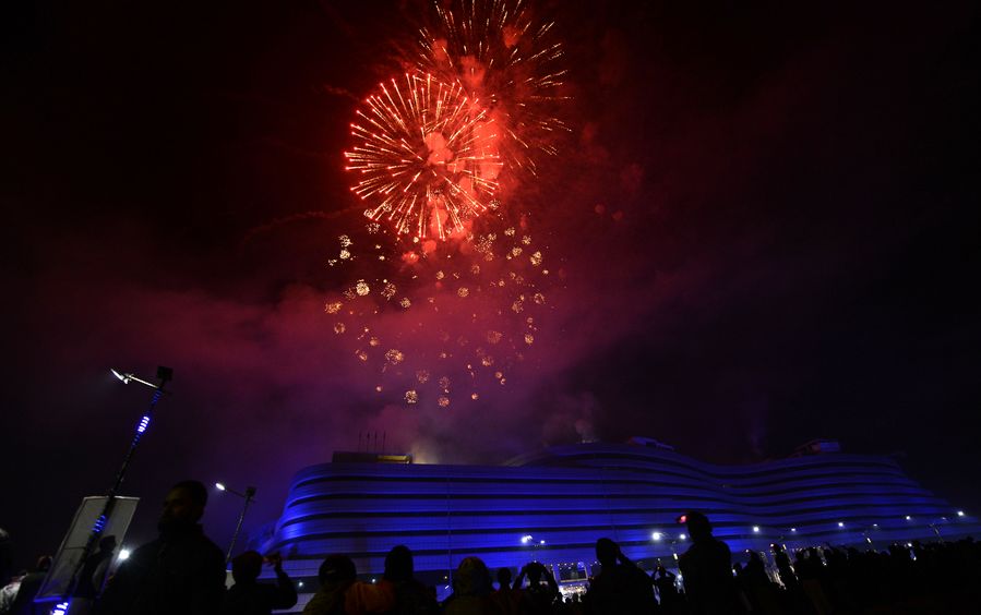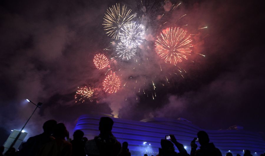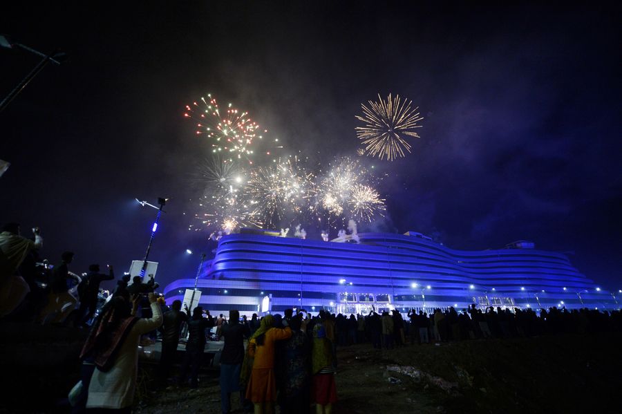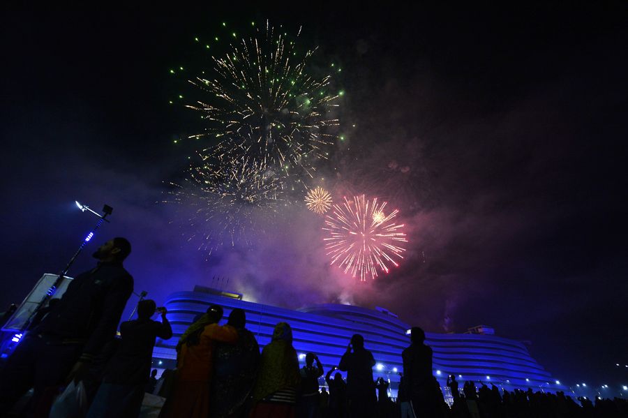 People enjoy fireworks during a New Year celebration in Rawalpindi, Pakistan, on Jan. 1, 2020. (Xinhua/Ahmad Kamal) ■