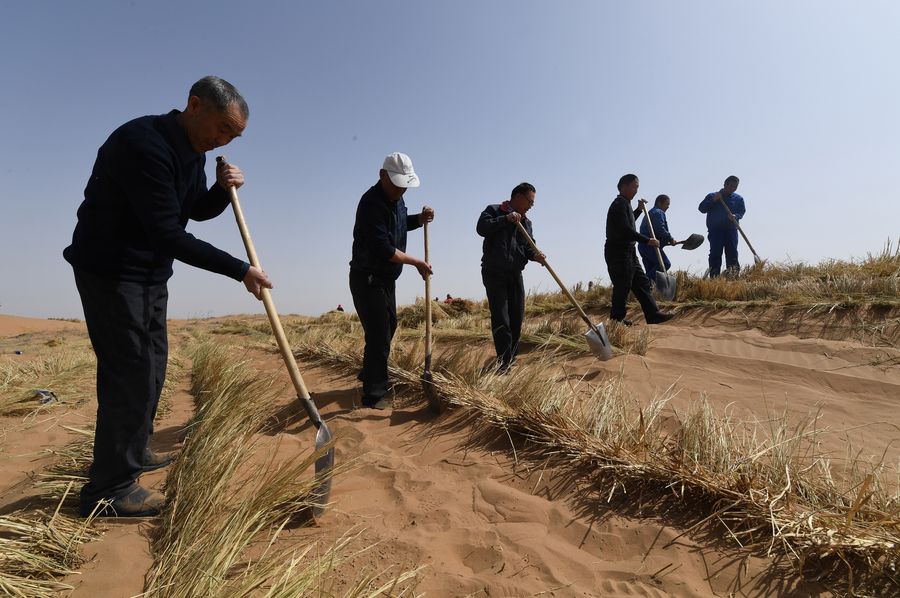 Staff members of Babusha forest farm pave straws to prevent and control desertification in Gulang County of Wuwei City, northwest China's Gansu Province, March 26, 2019. (Xinhua/Fan Peishen)