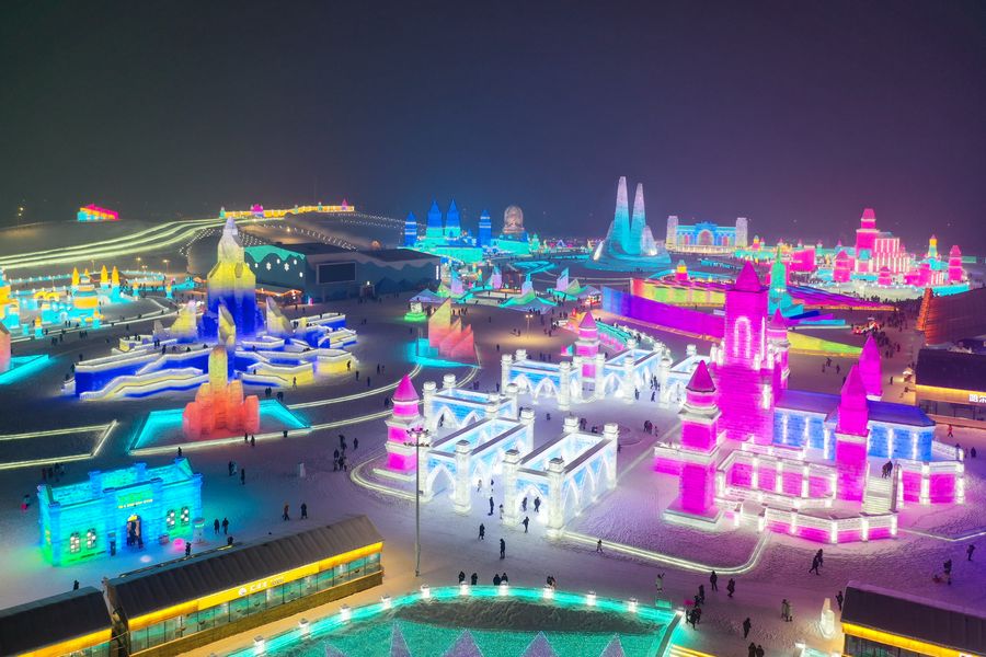 Aerial photo taken on Jan. 7, 2020 shows a night view of the 21st Harbin Ice-Snow World in Harbin, capital of northeast China's Heilongjiang Province. (Xinhua/Xie Jianfei)
