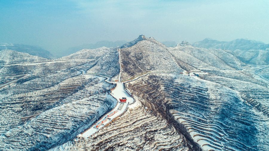 Aerial photo taken on Jan. 8, 2020 shows the snow-covered terraced fields in Houchi Village of Shexian County, north China's Hebei Province. (Xinhua/Wang Xiao)
