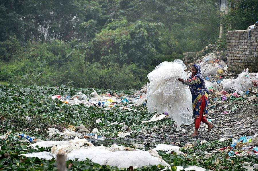 A woman carries plastic waste at a dumping site in Dhaka, Bangladesh on Jan. 8, 2020. A High Court Division bench in Bangladesh has directed the authorities concerned to ban single-use plastic products in coastal areas and hotels, motels and restaurants across the country within the next one year. (Str/Xinhua)■