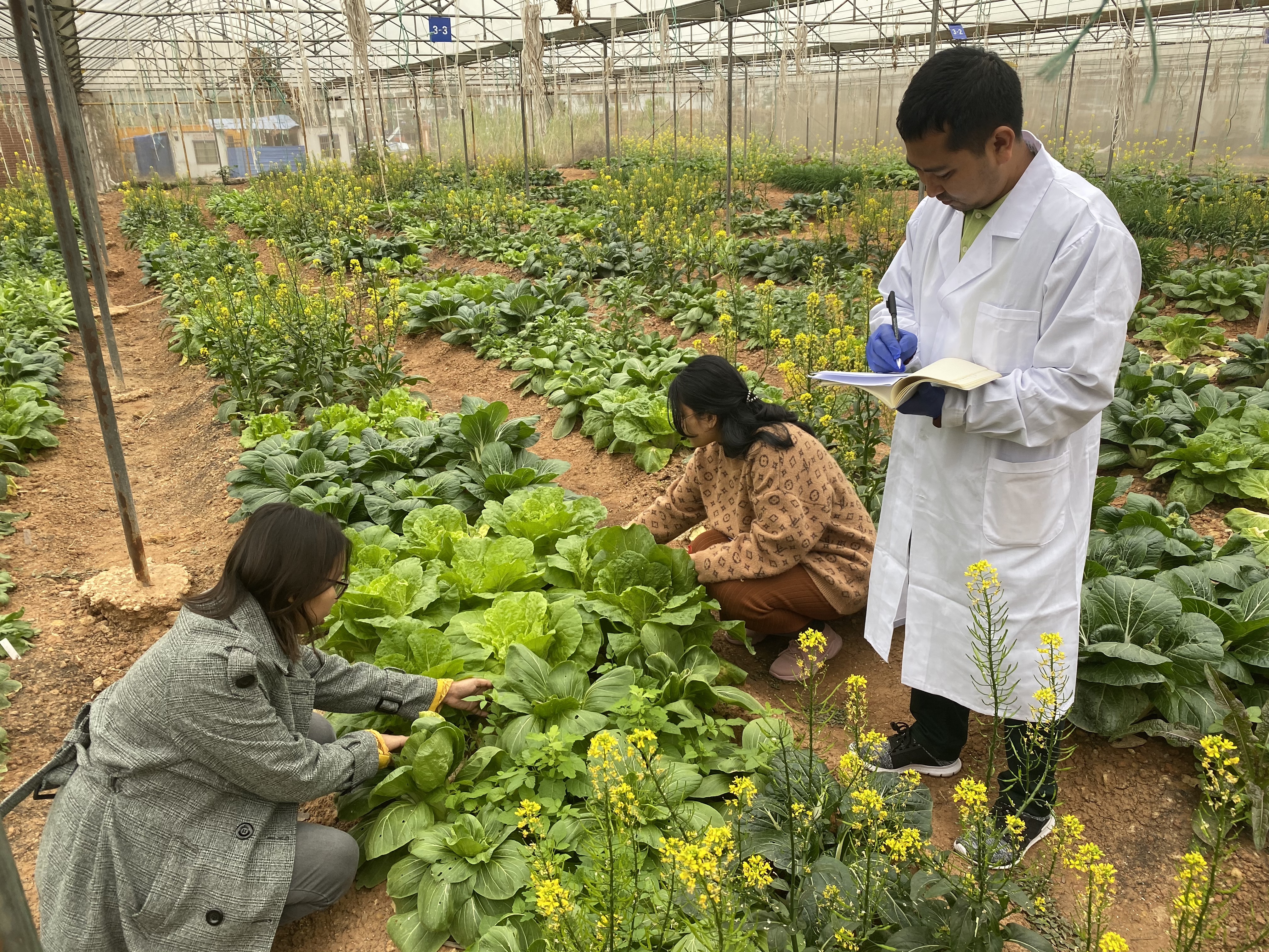Khaing Phyo Wai (L1) and Thaw Thaw Han (R1) are checking samples at a test field in Guangxi University for Nationalities in Nanning, south China's Guangxi Zhuang Autonomous Region, Jan. 13, 2020. (Xinhua/Zhao Manjun)