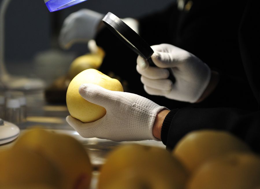 A staff member of the Shijiazhuang Customs checks the quality of a pear for export to Brazil, in the city of Cangzhou, north China's Hebei Province, Jan. 14, 2020. (Xinhua/Mu Yu)