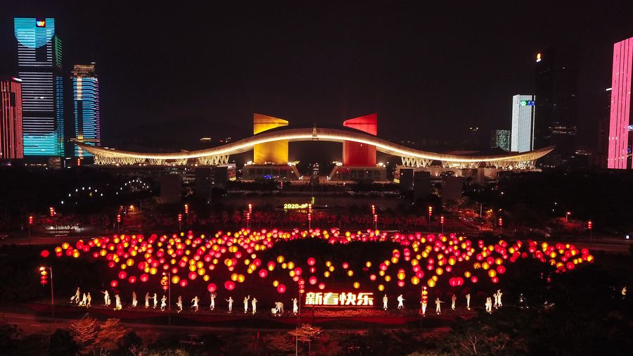 Aerial photo taken on Jan. 19, 2020 shows lanterns being illuminated to greet the coming Spring Festival in Shenzhen, south China's Guangdong province. (Xinhua/Mao Siqian)■