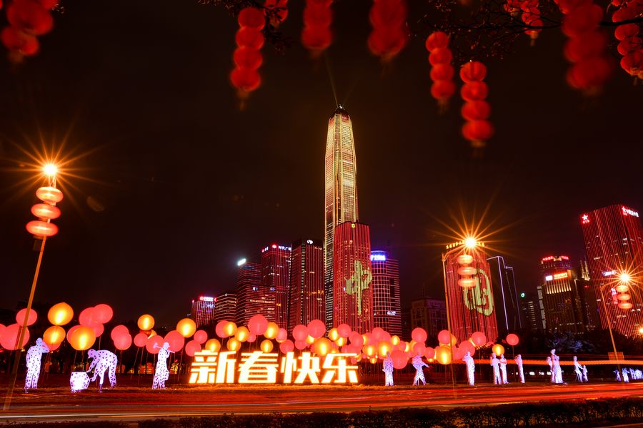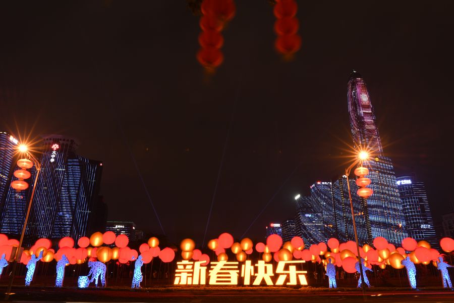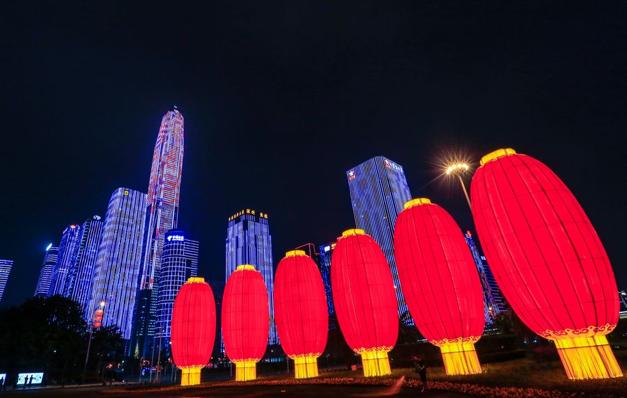 Photo taken on Jan. 19, 2020 shows lanterns being illuminated to greet the coming Spring Festival in Shenzhen, south China's Guangdong province. (Xinhua/Mao Siqian)