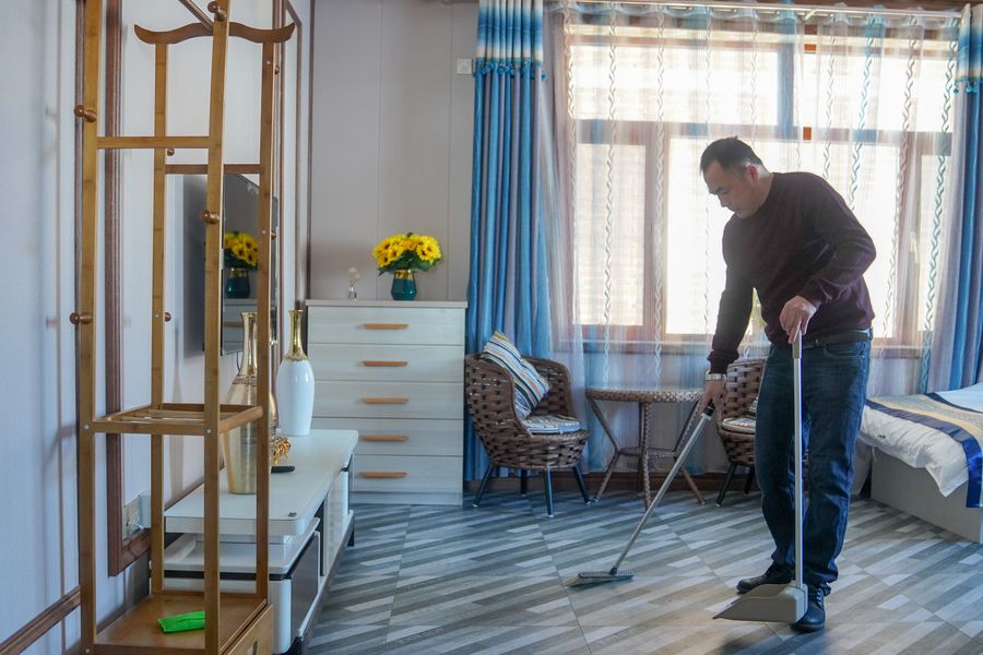 Chen Xiukun cleans a room at his homestay in Sihe Village of Shulan City, northeast China's Jilin Province, Jan. 21, 2020. (Xinhua/Zhang Nan)