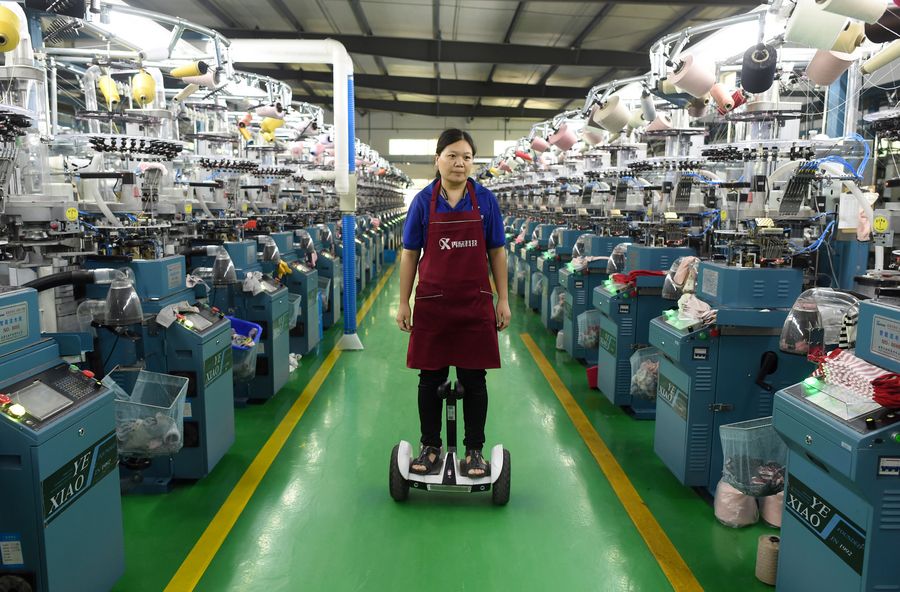 A worker inspects machines at a smart workshop of a hosiery company in Zhuji, east China's Zhejiang Province, Oct. 23, 2019. (Xinhua/Han Chuanhao)