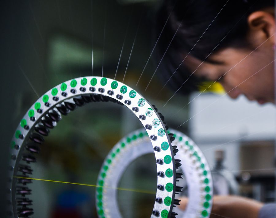 A worker inspects a production line for ultra-fine electronic wires at Zhejiang Tony Electronic Co., Ltd. in Huzhou, east China's Zhejiang Province, Jan. 5, 2020. (Xinhua/Xu Yu)