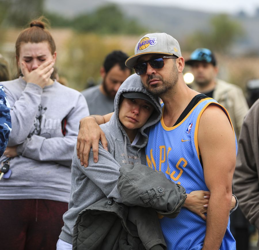 A man and a woman were seen grieving over the death of retired NBA star Kobe Bryant near the site of a helicopter crash in Calabasas of southern California, the United States, on Jan. 26, 2020. (Xinhua/Li Ying)