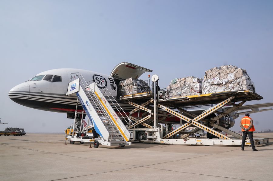 Medical materials are unloaded from a plane at the Wuhan Tianhe International Airport in Wuhan, central China's Hubei Province, Jan. 28, 2020. (Xinhua/Cheng Min)