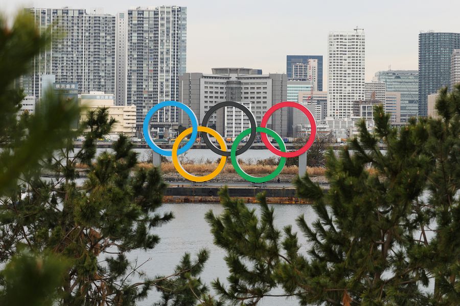 Fireworks explode over the illuminated Olympic rings during an event to mark six months before the opening of the Tokyo 2020 Olympic Games in Tokyo, Japan, on Jan. 24, 2020. (Xinhua/Wang Zijiang)