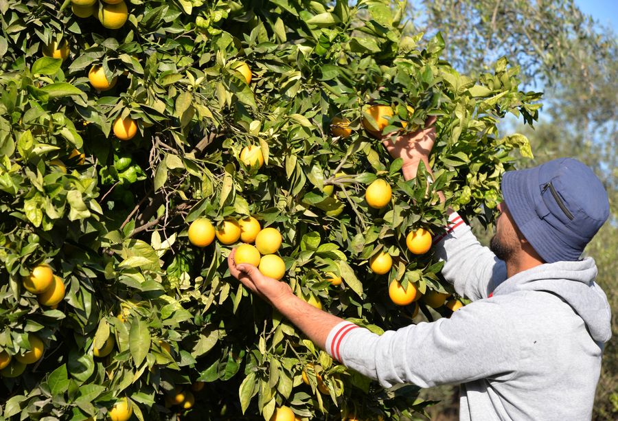 A Palestinian farmer picks oranges in an orchard in the northern Gaza Strip town of Beit Lahia, on Nov. 28, 2019. (Xinhua/Rizek Abdeljawad)