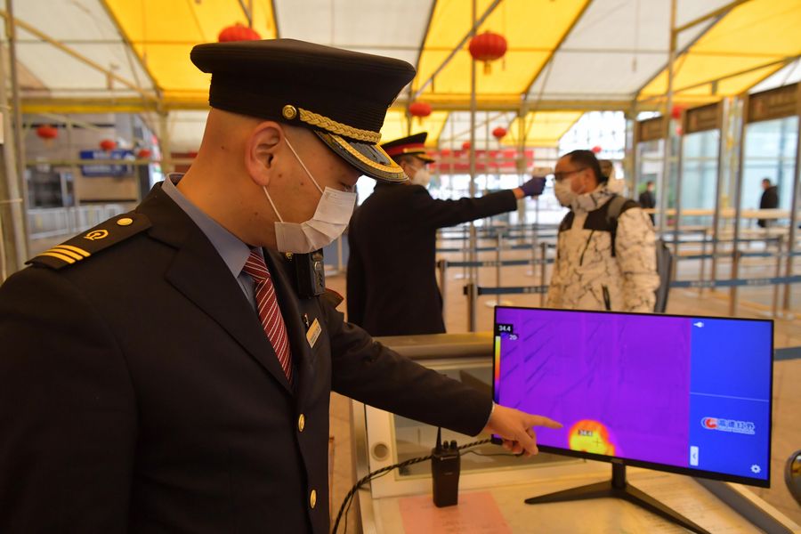 A worker checks passengers' body temperature at Nanchang Railway Station in Nanchang, east China's Jiangxi Province, Feb. 7, 2020. (Xinhua/Peng Zhaozhi)