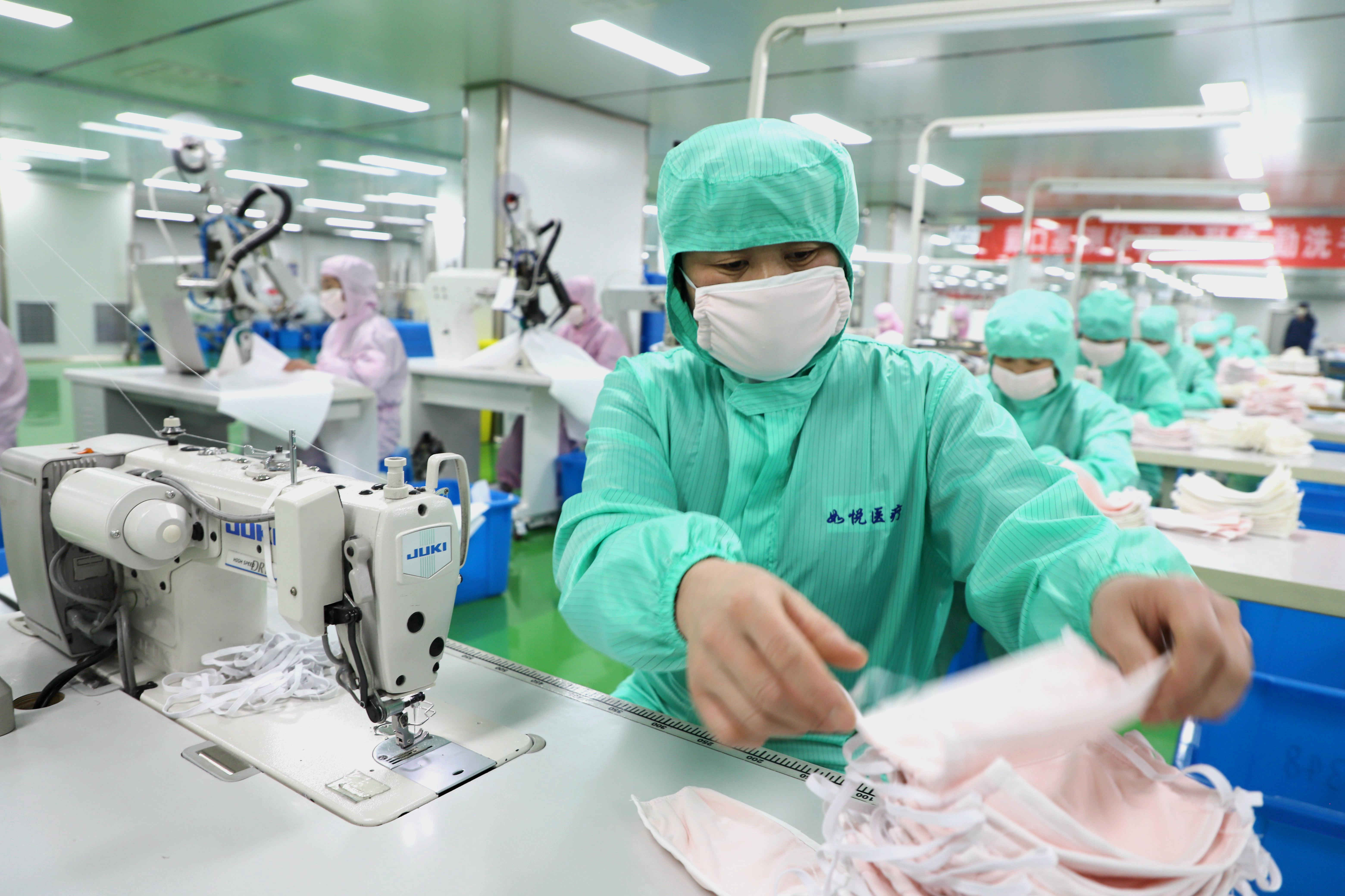 Workers make masks at a medical technology company in Binzhou High-tech Industry Development Zone in Binzhou City, east China's Shandong Province, Feb. 8, 2020. (Xinhua/Chu Baorui)