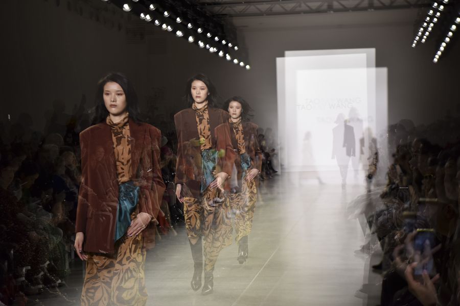 Models present creations of Taoray Wang at New York Fashion Week Fall/Winter 2020 in New York, the United States, on Feb. 11, 2020. (Xinhua/Han Fang)