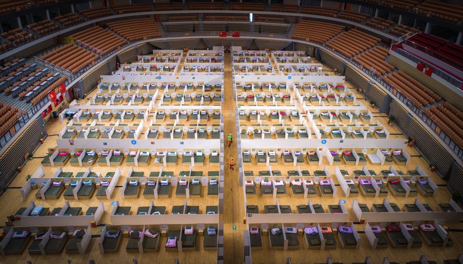 Photo taken on Feb. 12, 2020 shows the interior of the temporary hospital converted from Wuhan Sports Center in Wuhan, central China's Hubei Province. With the fundamental facilities being set up, the temporary hospital with a total of 1,100 beds is ready to admit patients with mild symptoms caused by the novel coronavirus. (Xinhua/Xiao Yijiu)