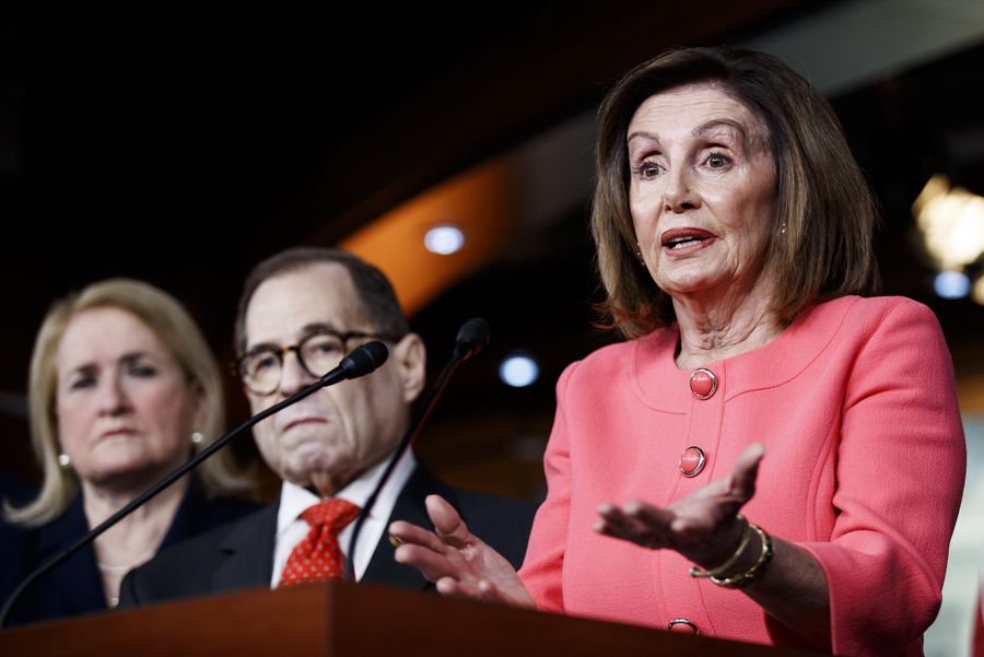 U.S. House Speaker Nancy Pelosi (R) speaks during a press conference in Washington D.C., the United States, on Jan. 15, 2020. (Photo by Ting Shen/Xinhua)