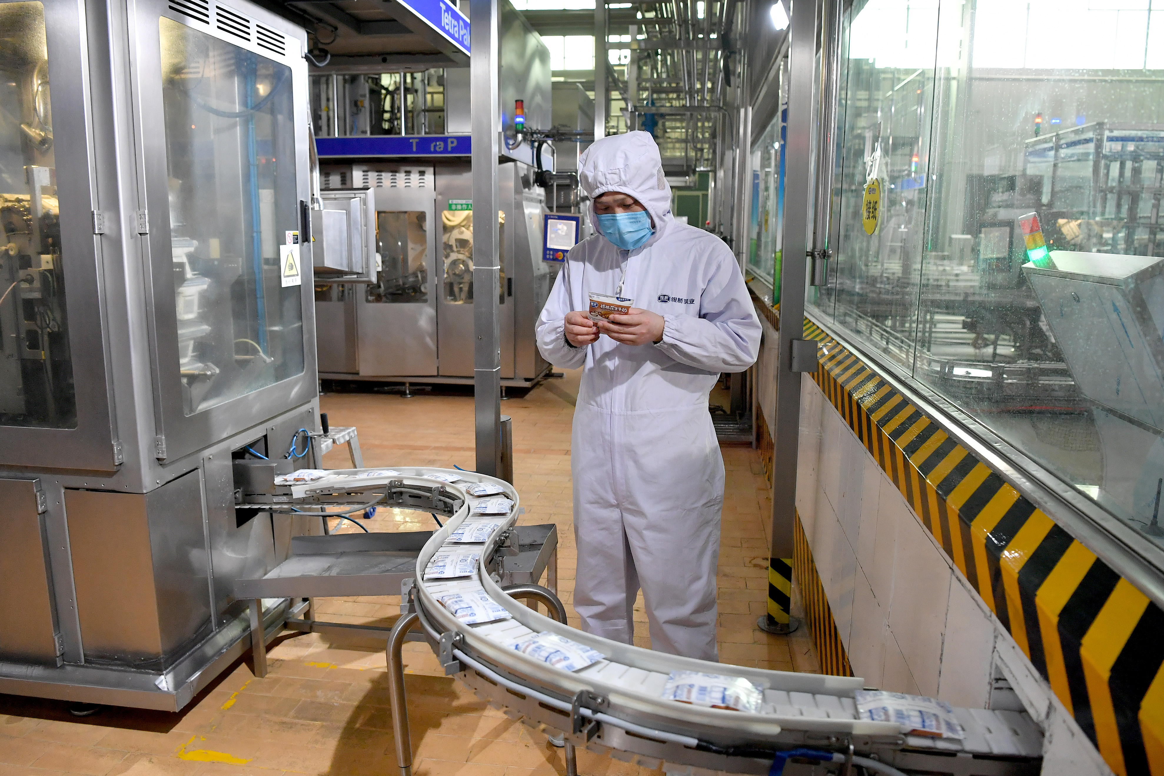 A worker works at Xi'an Yinqiao Dairy Company in Lintong District of Xi'an, northwest China's Shaanxi Province, Feb. 26, 2020. (Xinhua/Liu Xiao)