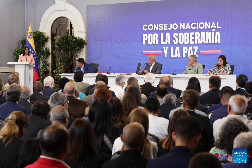 Venezuelan Vice President Delcy Rodriguez (1st L) speaks at a meeting of the National Council for Sovereignty and Peace in Caracas, Venezuela, on Sept. 29, 2025. Venezuelan President Nicolas Maduro signed a decree on "State of External Commotion" in response to what the government described as foreign aggressions, Vice President Delcy Rodriguez said here Monday. (The National Assembly of Venezuela/Handout via Xinhua)