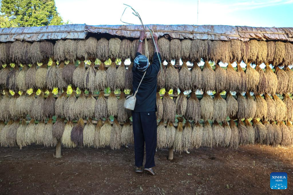 This photo taken on Oct. 5, 2025 shows a man tying leaf weaving roof to cover bunches of harvested paddy during the Seren Taun festival in Sukabumi regency of West Java, Indonesia. Seren Taun is a traditional festival for local people to celebrate paddy harvest and express gratitude. (Photo by Rangga Firmansyah/Xinhua)