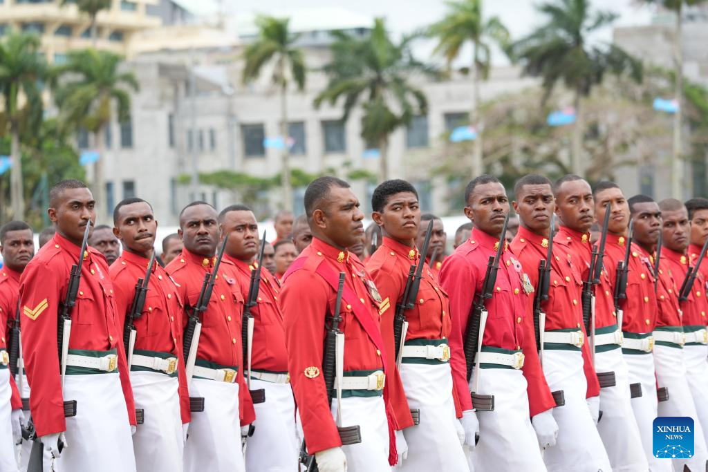 Soldiers participate in the military parade at the Albert Park in Suva, capital of Fiji, Oct. 10, 2025. The Fiji Day celebration in Suva kicked off on Friday morning with a march from the Flea Market to Albert Park, to commemorate the 55th anniversary of Fiji's independence. This year's celebration is held under the theme "Peace, Unity and Progress for All." (Photo by Gao Xin/Xinhua)