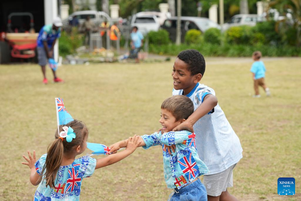 Kids celebrate the 55th anniversary of Fiji's independence at the Albert Park in Suva, capital of Fiji, Oct. 10, 2025. The Fiji Day celebration in Suva kicked off on Friday morning with a march from the Flea Market to Albert Park, to commemorate the 55th anniversary of Fiji's independence. This year's celebration is held under the theme "Peace, Unity and Progress for All." (Photo by Gao Xin/Xinhua)