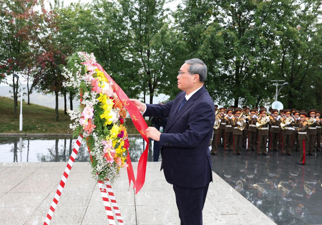 Chinese Premier Li Qiang, also a member of the Standing Committee of the Political Bureau of the Communist Party of China Central Committee, pays homage to the martyrs of the Chinese People's Volunteer Army (CPV) at a cemetery in Anju, the Democratic People's Republic of Korea (DPRK), Oct. 10, 2025. This year marks the 75th anniversary of the CPV's participation in the War to Resist U.S. Aggression and Aid Korea. (Xinhua/Huang Jingwen)
