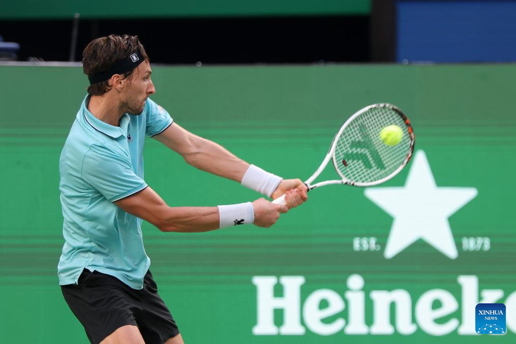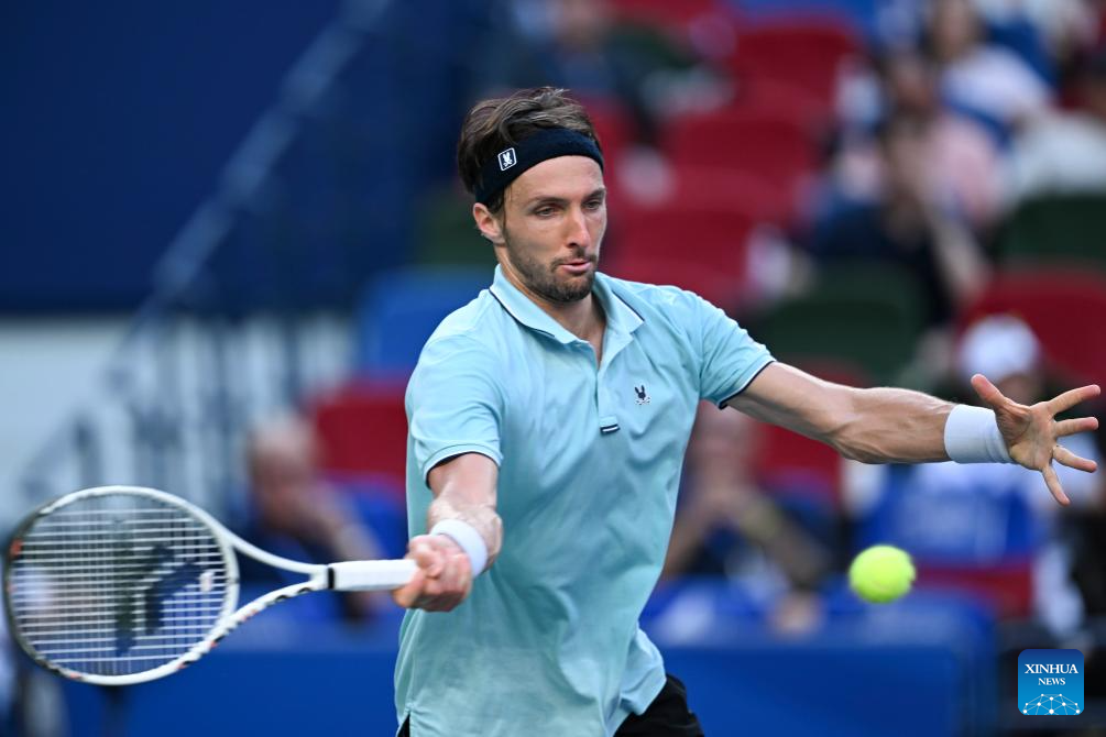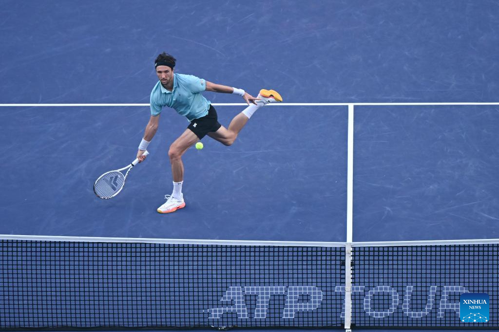 Arthur Rinderknech of France hits a return to Felix Auger-Aliassime of Canada during the men's singles quarterfinal at the ATP World Tour Shanghai Masters tennis tournament in Shanghai, east China, Oct. 10, 2025. (Xinhua/Wang Xiang)