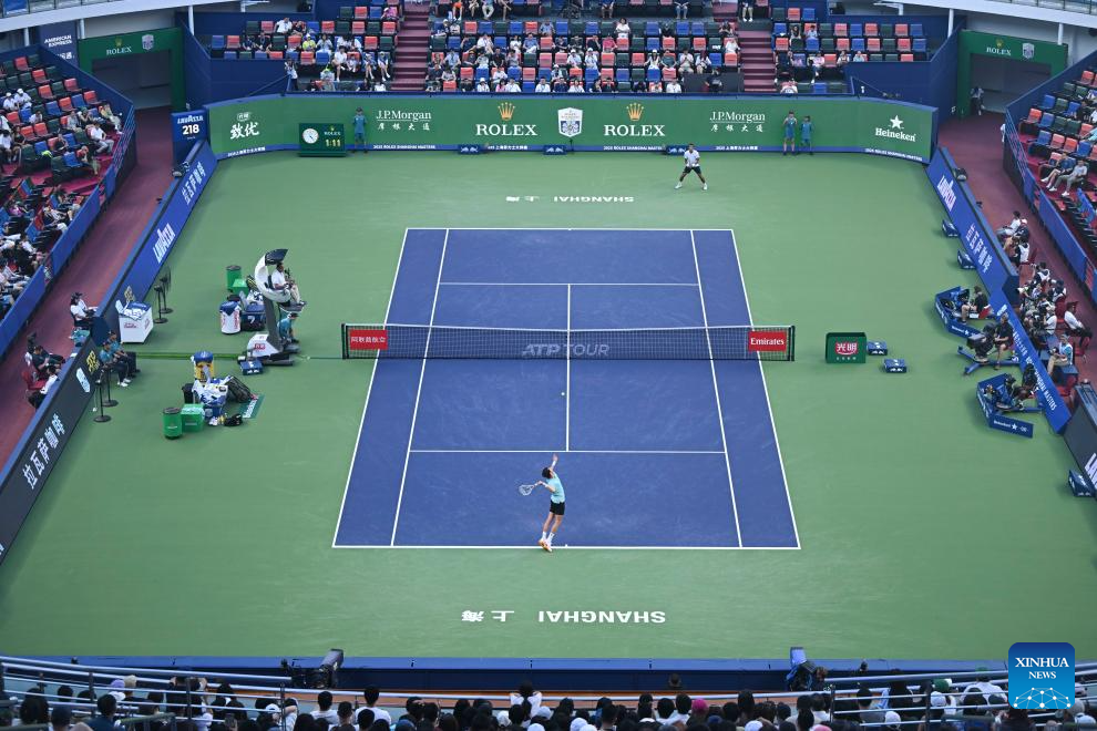 Arthur Rinderknech (below) of France serves to Felix Auger-Aliassime of Canada during the men's singles quarterfinal at the ATP World Tour Shanghai Masters tennis tournament in Shanghai, east China, Oct. 10, 2025. (Xinhua/Chen Haoming)