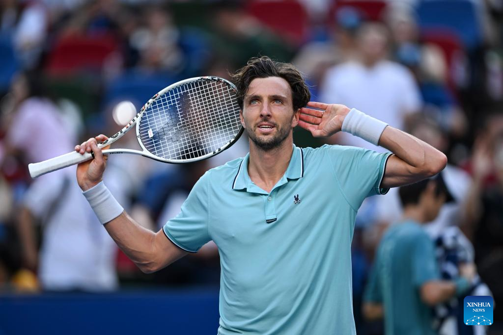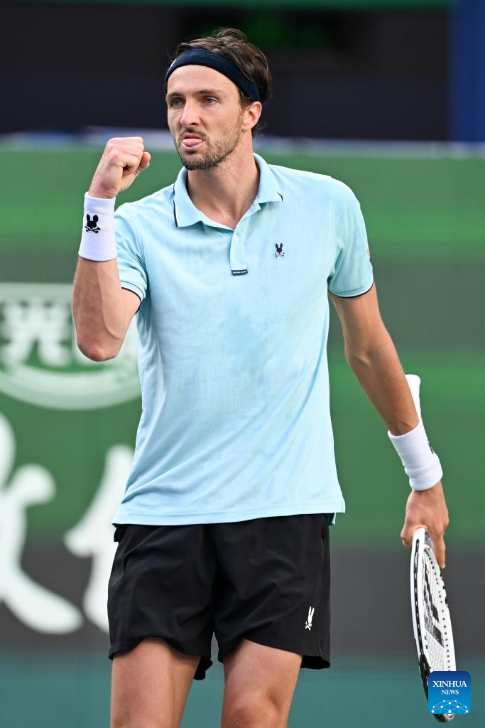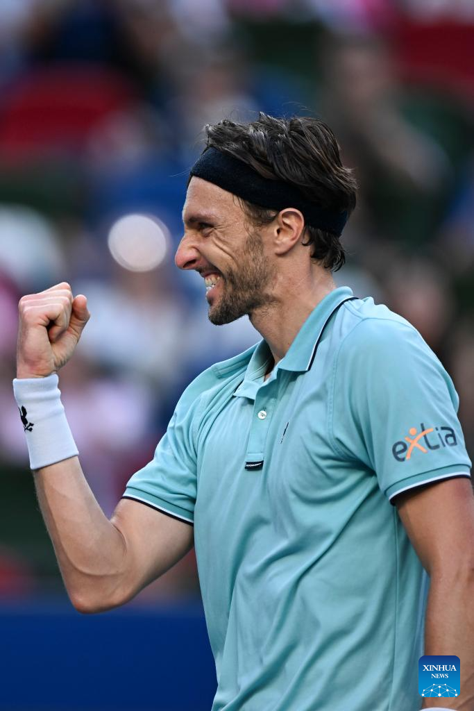 Arthur Rinderknech of France reacts after defeating Felix Auger-Aliassime of Canada in the men's singles quarterfinal at the ATP World Tour Shanghai Masters tennis tournament in Shanghai, east China, Oct. 10, 2025. (Xinhua/Wang Xiang)