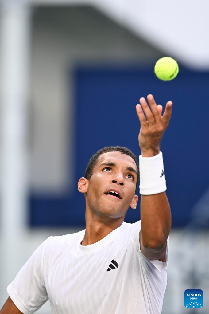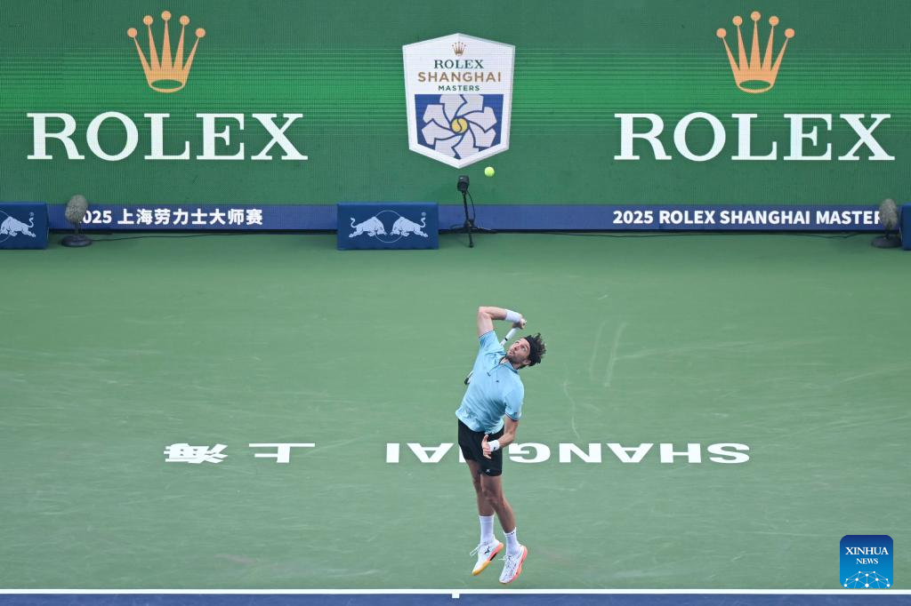 Felix Auger-Aliassime of Canada serves to Arthur Rinderknech of France during the men's singles quarterfinal at the ATP World Tour Shanghai Masters tennis tournament in Shanghai, east China, Oct. 10, 2025. (Xinhua/Chen Haoming)
