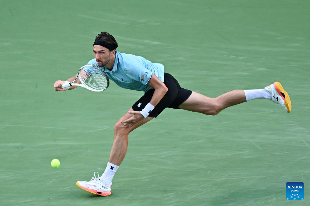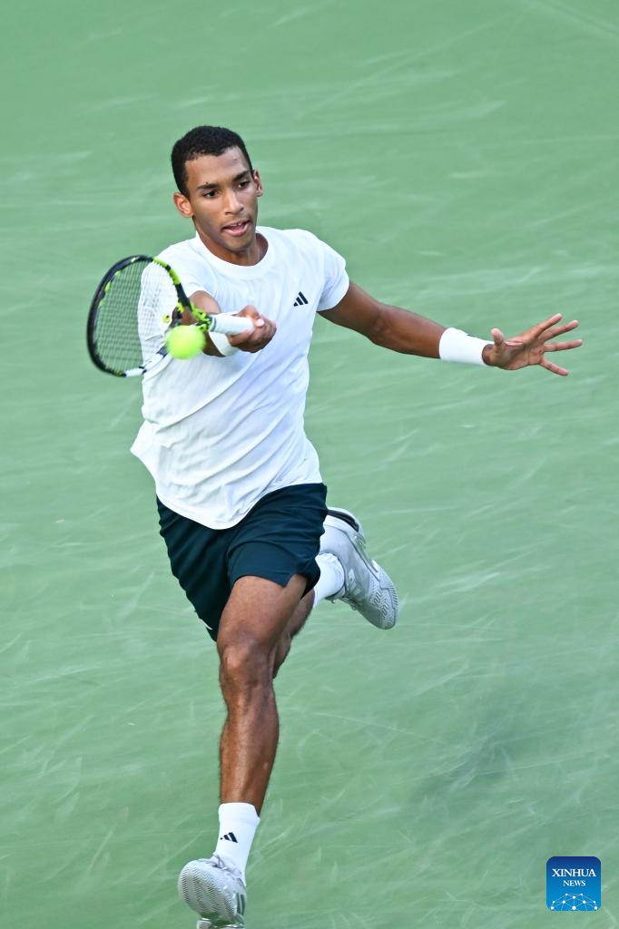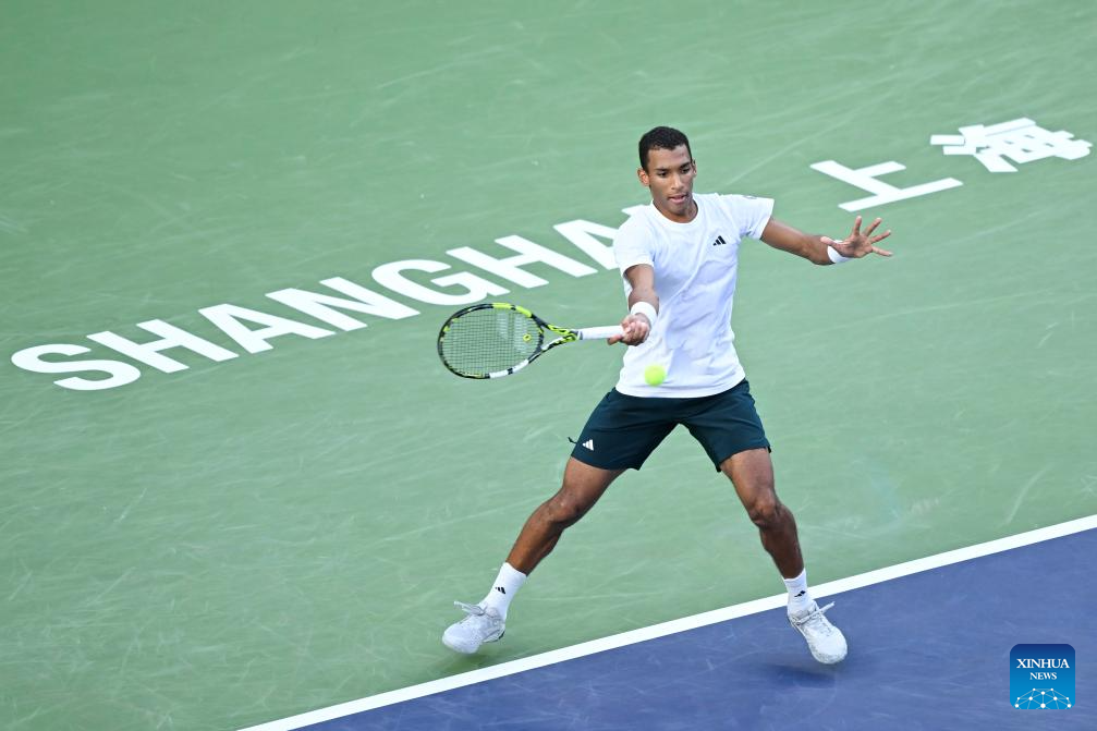 Felix Auger-Aliassime of Canada hits a return to Arthur Rinderknech of France during the men's singles quarterfinal at the ATP World Tour Shanghai Masters tennis tournament in Shanghai, east China, Oct. 10, 2025. (Xinhua/Chen Haoming)